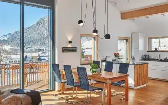 Es ist ein sonniger, aber kalter Wintermorgen in den Tiroler Bergen. In der Nacht ist Neuschnee gefallen, der sich nun als glitzernde Decke über die Wiesen, Häuser und die charakteristischen Gipfel des Kaisergebirges legt. Elke Horn hat es sich mit einem Buch in ihrem großen Sessel gemütlich gemacht. Doch zum Lesen kommt sie nicht. Stattdessen genießt sie den malerischen Ausblick durch die großzügige Giebelverglasung ihres neuen Domizils – ein modernes Landhaus aus der Feder des Holzhausspezialisten Baufritz. Mit der hellen Lärchenholzverschalung und den weiten Dachüberständen fügt es sich harmonisch in seine traditionell geprägte Umgebung ein. Ergänzt wird das Bild von einem umlaufenden Holzbalkon, der im Sommer von einem leuchtenden Blütenmeer umrahmt wird. Jetzt im Winter ist er mit zahlreichen Lichtern geschmückt, die am Abend eine romantische Stimmung zaubern. Dass es sich bei dem Gebäude um ein Doppelhaus handelt, ist auf den ersten Blick kaum zu erkennen. Schaut man jedoch genauer hin, bemerkt man, dass es aus zwei Baukörpern besteht, die leicht versetzt zueinander angeordnet wurden. Ein planerischer Kniff, der die Privatsphäre der benachbarten Familien wahrt.Grundrisse und Hausmaße